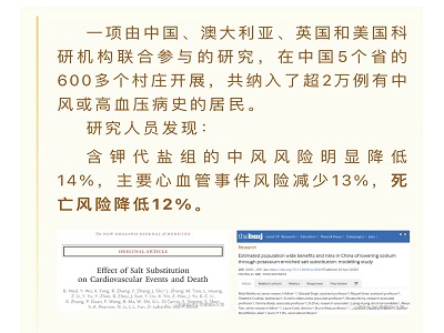 研究显示,只要把家里的盐换成低钠盐,即使吃盐量没变,血压还是降下去了。血压一下去,心血管疾病风险以及死亡风险自然而然也降低了。