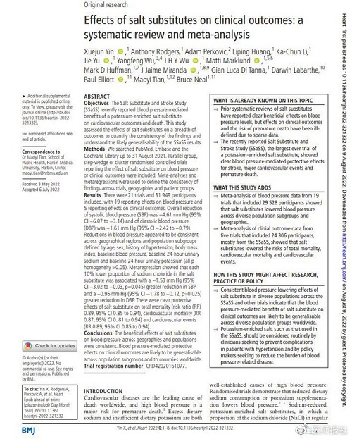 一项最新研究结果证实低钠盐可降低心脏病发作,以及中风、心血管疾病死亡和全因死亡的风险;与此同时,低钠盐对心脑血管疾病的保护作用,同样适用于世界各地的所有人,不论国家和人群。由哈尔滨医科大学公共卫生学院特聘教授、澳大利亚新南威尔士大学乔治全球健康研究院荣誉高级研究员田懋一团队完成的一项最新成果《低钠盐对临床结果的影响:系统综述和荟萃分析》,2022年8月10在线发表于最新一期《英国医学杂志》的子刊、英国心血管学会官方杂志《心脏》上。