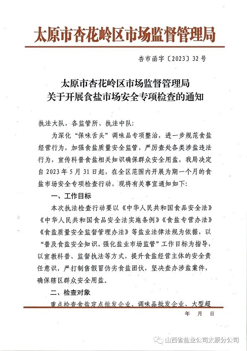 配合杏花岭区市场监督管理局对五龙口海鲜市场开展检查,重点检查了市场内调味品区食盐零售经营者。检查是否从食盐定点生产企业或食盐定点批发企业购进食盐,是否严格执行食品安全进货查验记录制度,是否存在向其他食盐零售终端和食品加工用盐单位转批食盐等违法行为。检查过程中还着重检查是否销售散装食盐以及是否销售不符合山西省碘盐浓度(18-33mg/kg)规定的食盐产品等。