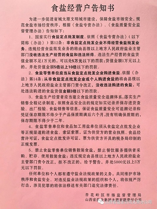 下一步,太原盐业将继续积极配合太原市市场监督管理局对辖区食盐经营、销售使用的商户继续加强监管,做好食盐相关宣传教育工作,“盐”阵以待,守护省城人民群众的舌尖安全。