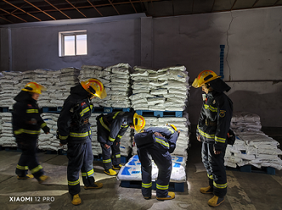 消防员和教官们首先对大同盐业办公场所消防通道和仓储消防设施、消防器材摆放进行了现场指导。