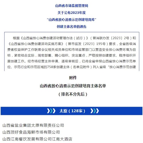 【祝贺】太原盐业荣获“山西省放心消费示范创建单位”称号