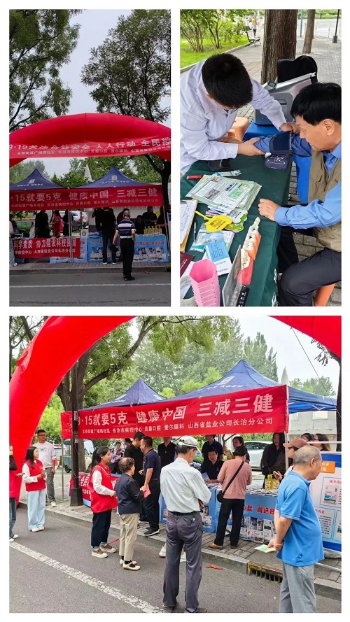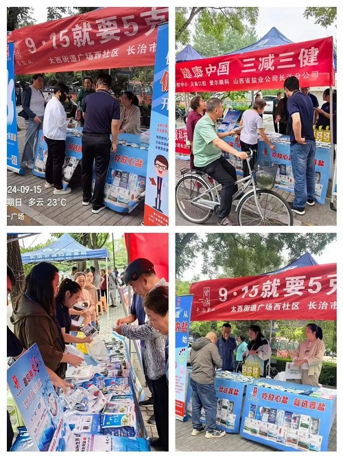 为积极推进以“三减三健”为主题的全民健康生活方式行动,推动社区居民践行绿色健康的生活方式,引导广大民众养成良好的生活饮食习惯,2024年9月14日-15日,长治盐业联合太西街道广场西社区、长治疾控中心、贝森口腔、爱尔眼科在八一广场开展了以“关注食盐安全,就要5克,人人行动,全民控盐”为主题的全民健康生活方式宣传活动。